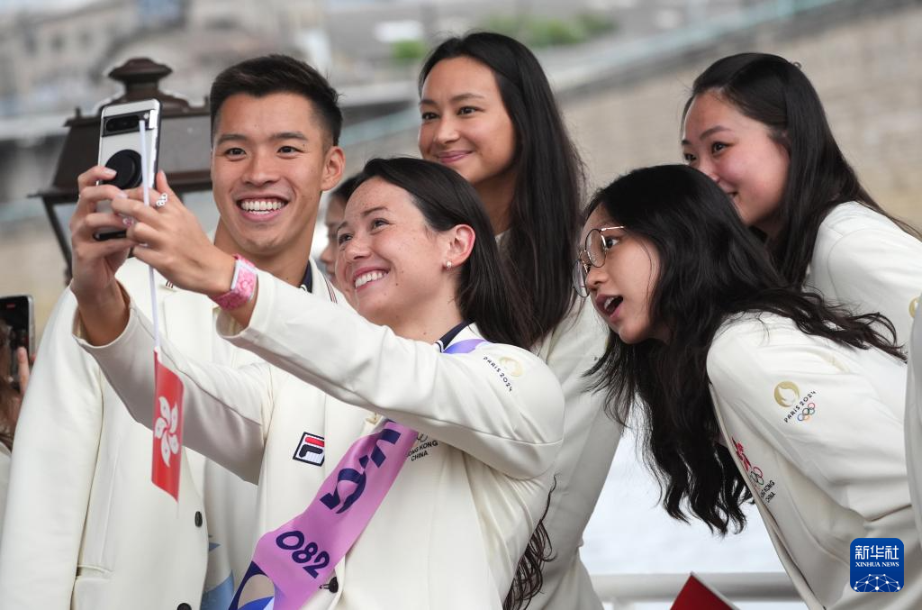 7月26日,中國香港體育代表團成員在開幕式上自拍。新華社記者 呂小煒 攝pagebreak