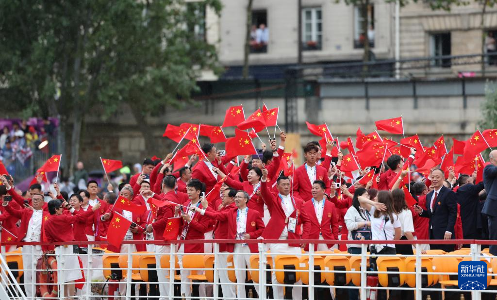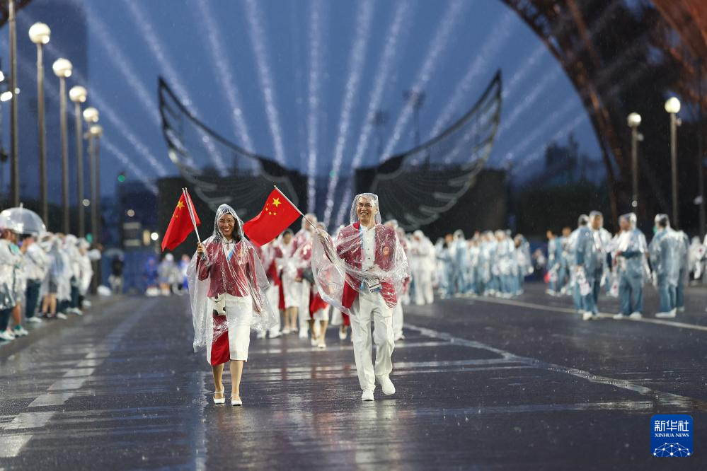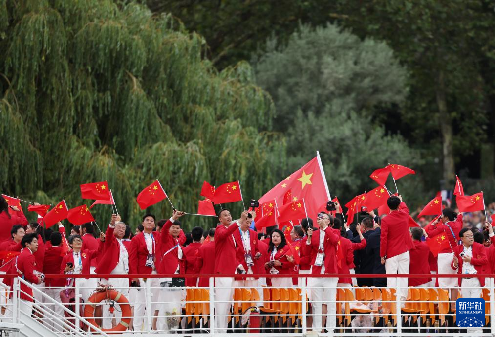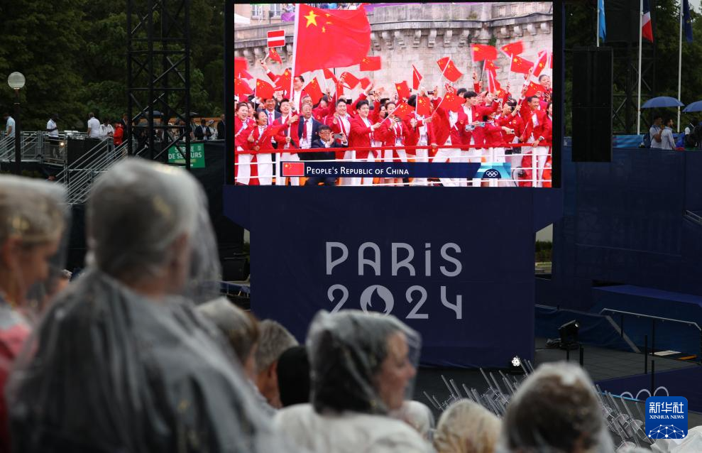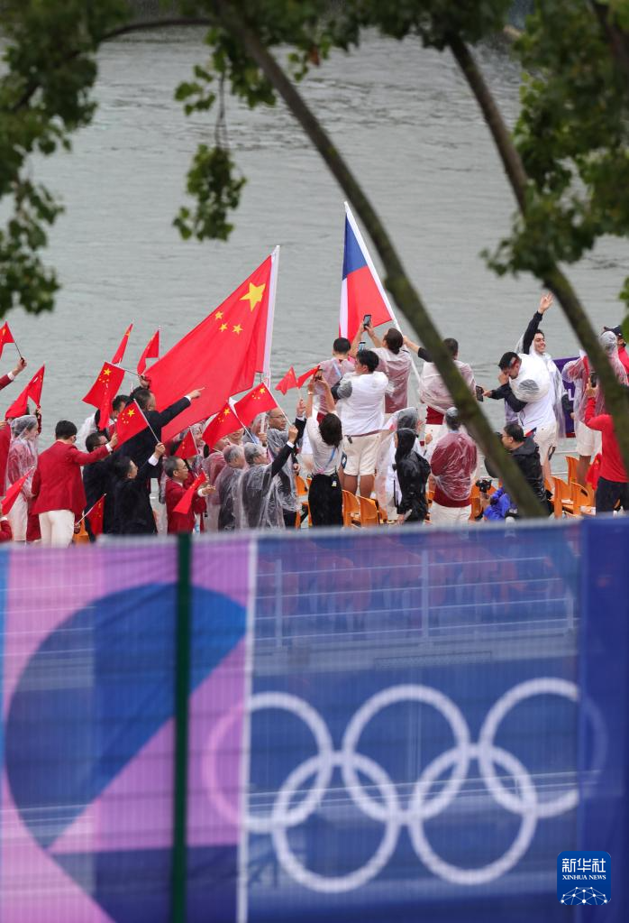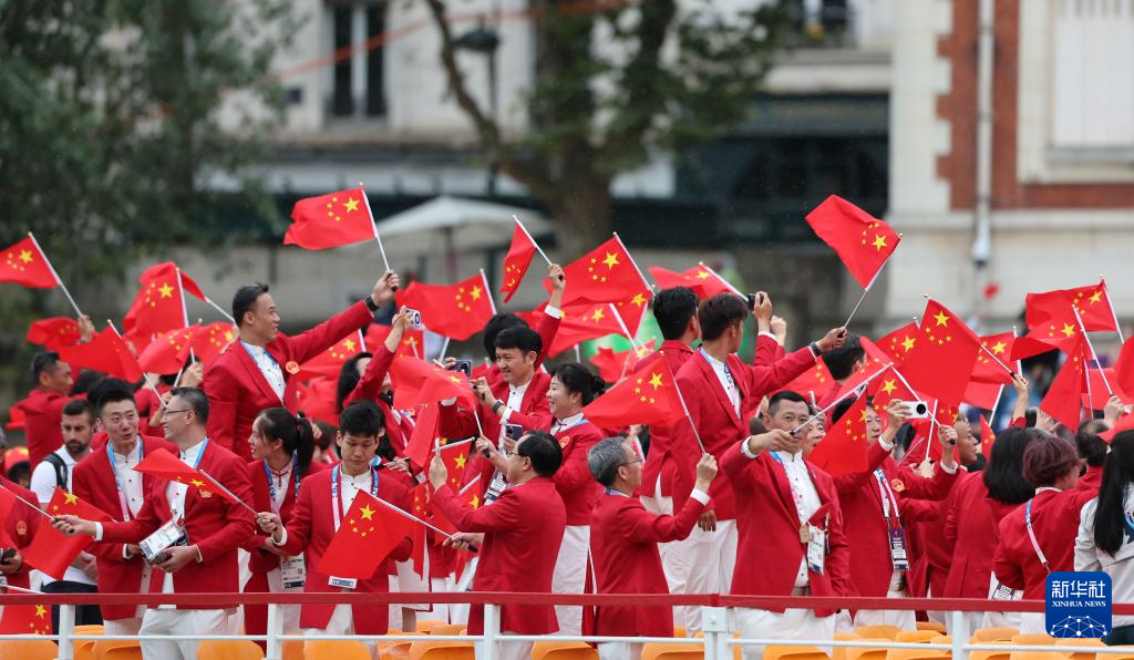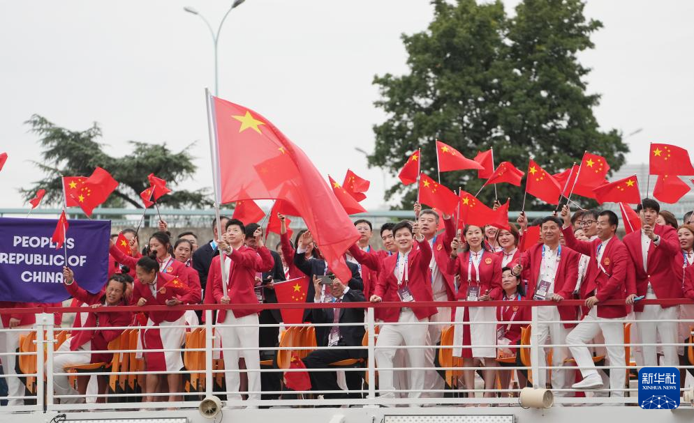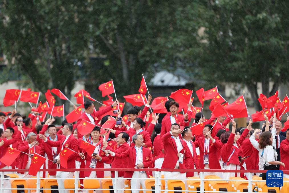 7月26日,中國體育代表團成員在開幕式現(xiàn)場。新華社記者 王毓國 攝