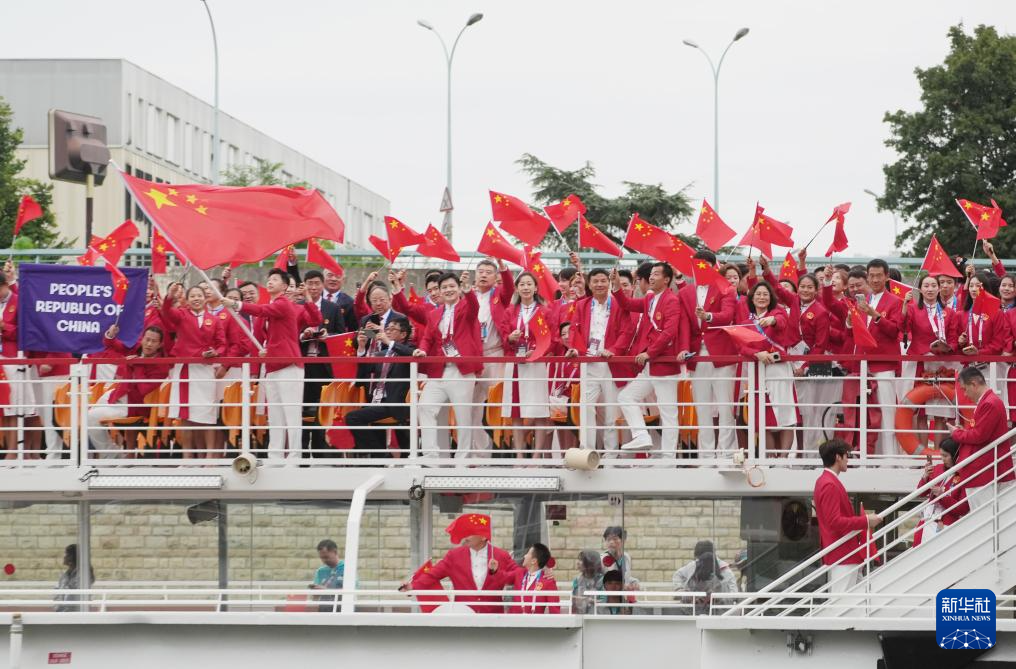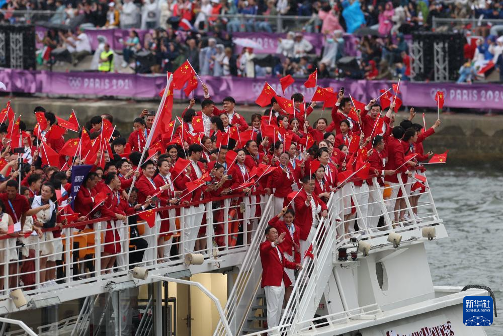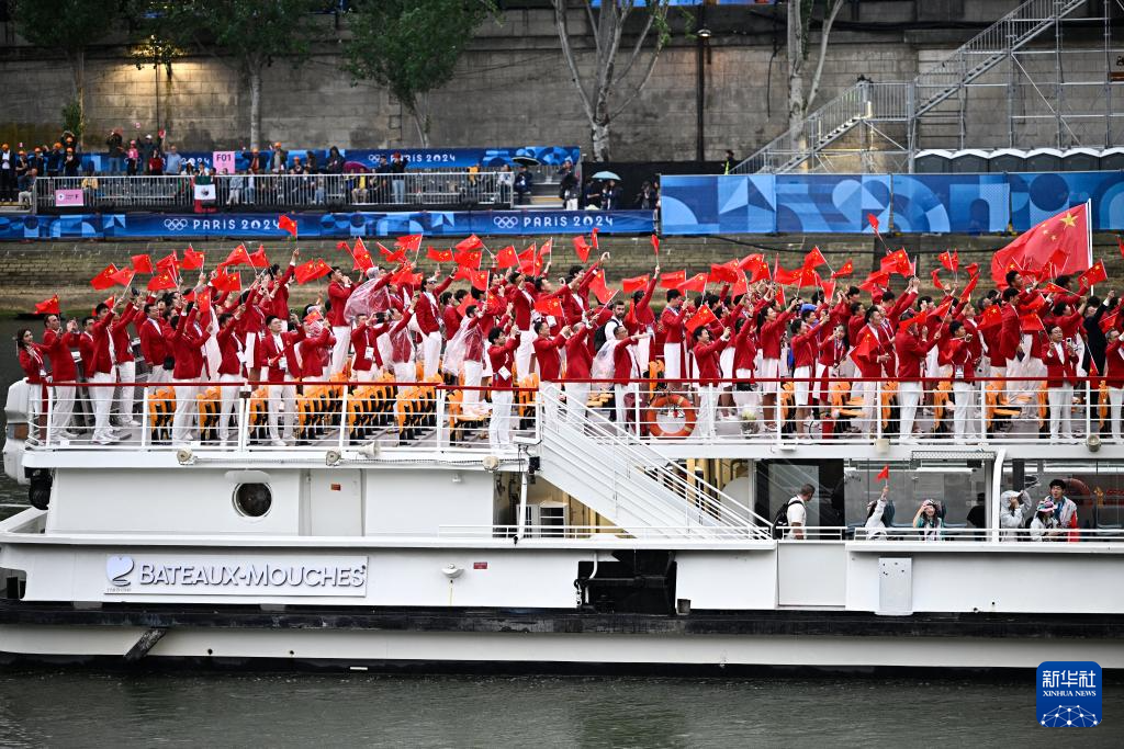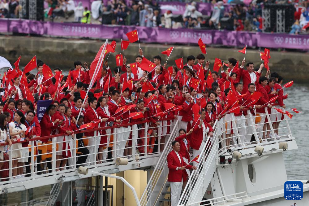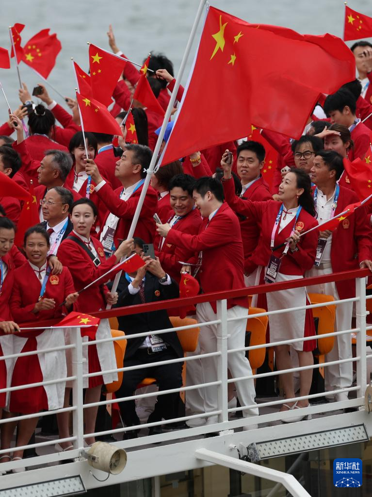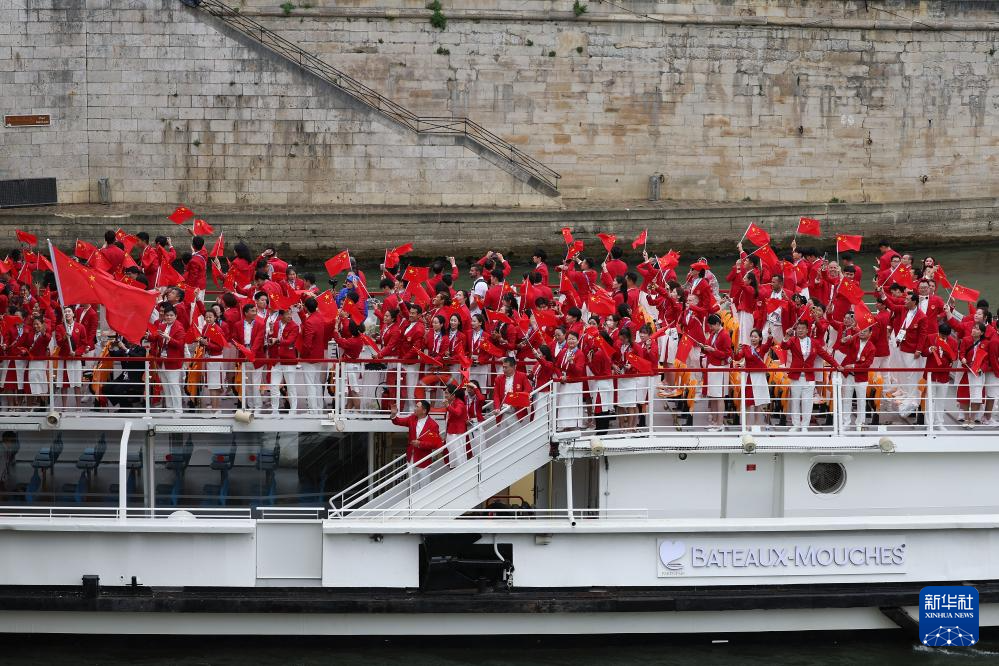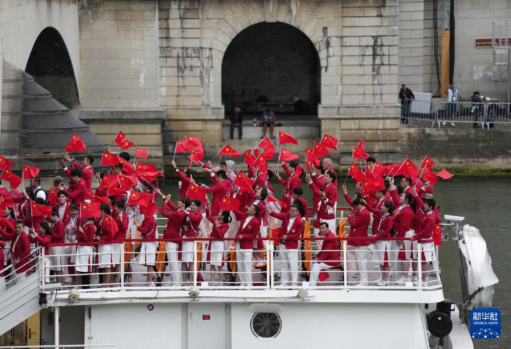 7月26日,中國體育代表團成員在開幕式現(xiàn)場。新華社記者 王毓國 攝