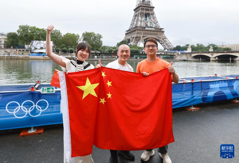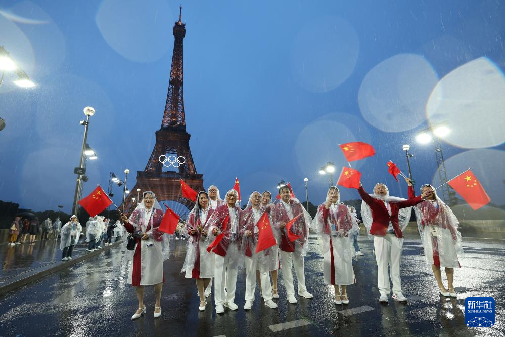 7月26日,中國體育代表團成員在埃菲爾鐵塔前。新華社記者 李明 攝pagebreak