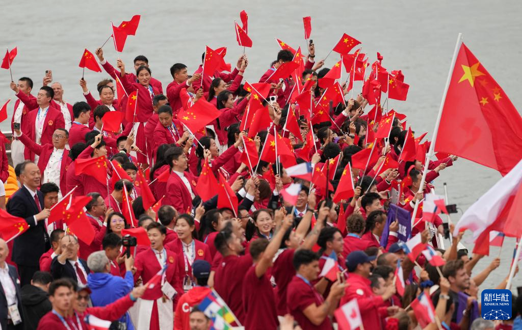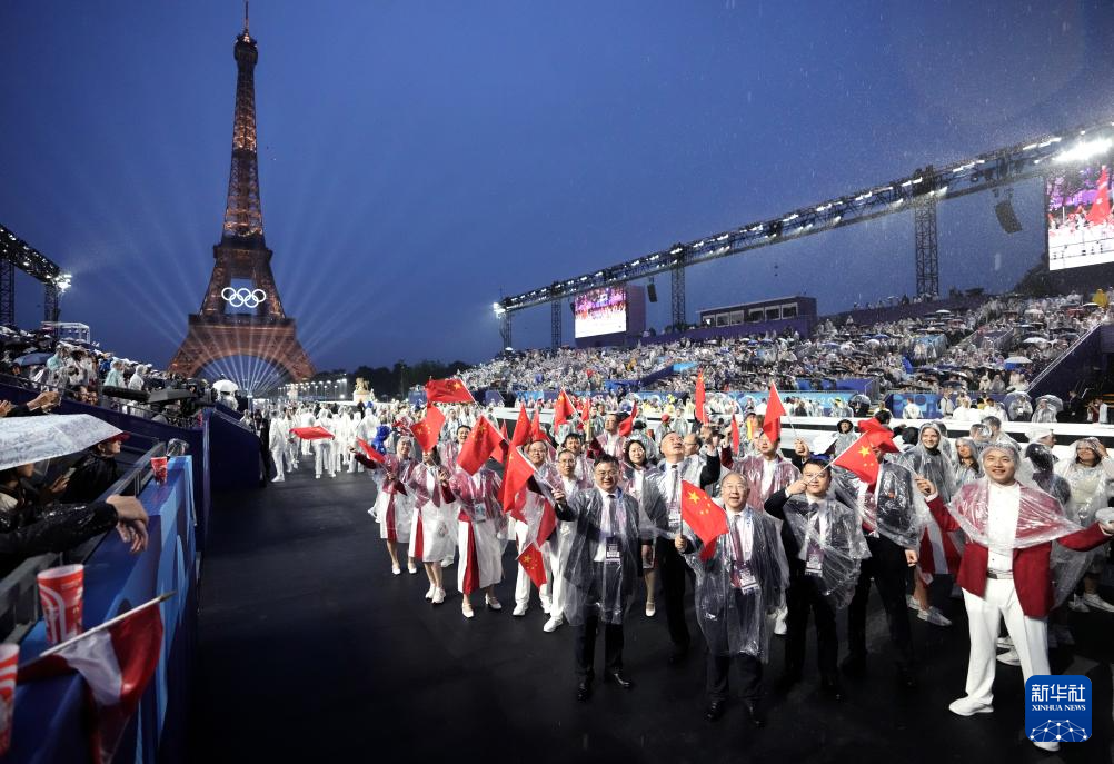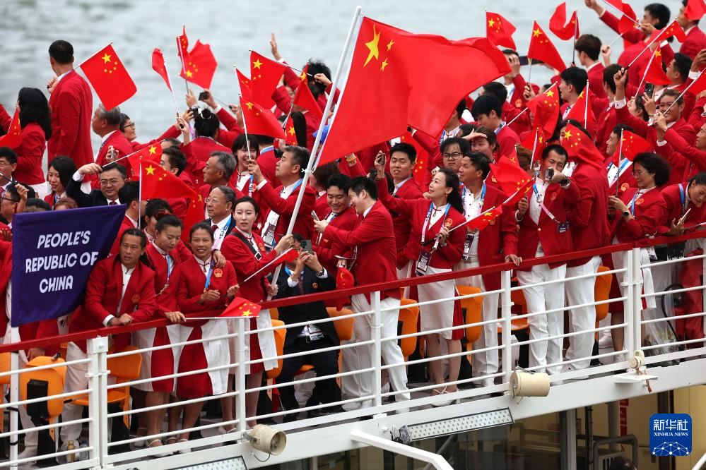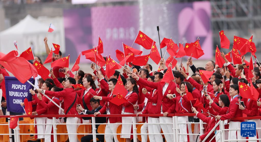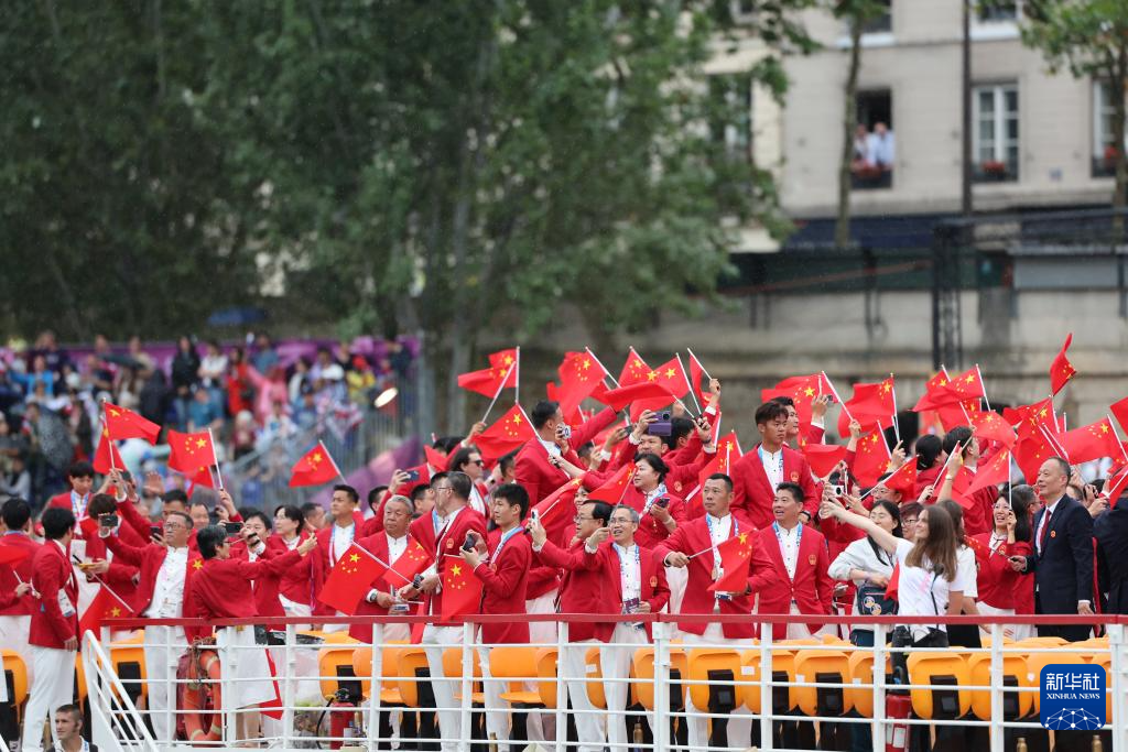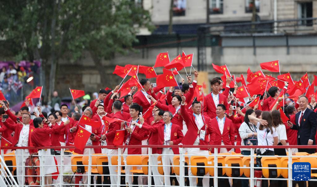 7月26日,中國體育代表團成員在開幕式上。新華社記者 萬象 攝