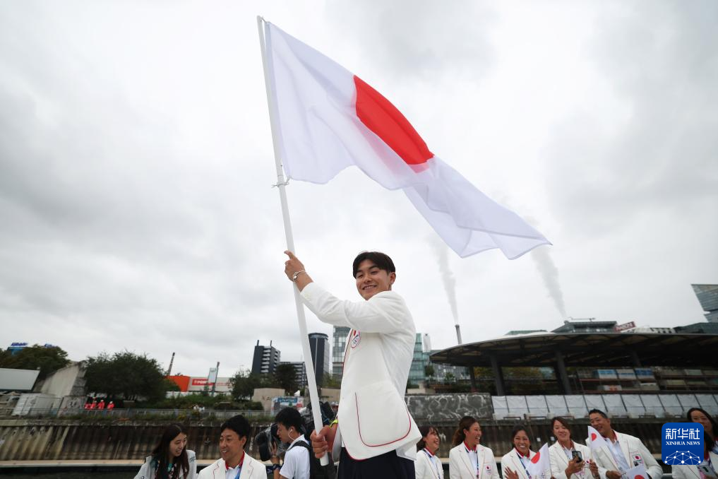 7月26日,日本體育代表團旗手、霹靂舞運動員半井重幸在開幕式上揮舞國旗。新華社發(fā)(POOL照片/邁克爾·里夫斯)pagebreak