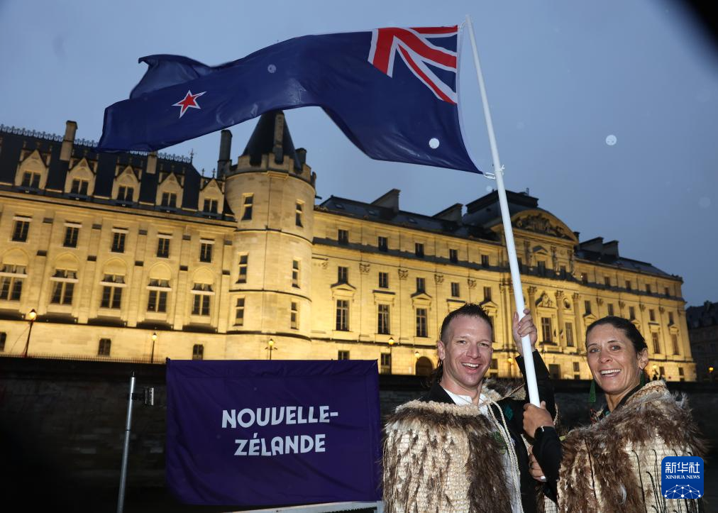 7月26日,新西蘭體育代表團旗手阿倫·默里·蓋特(左)與橋·阿萊在開幕式上揮舞國旗。新華社發(fā)(POOL照片/漢娜·皮特斯)
