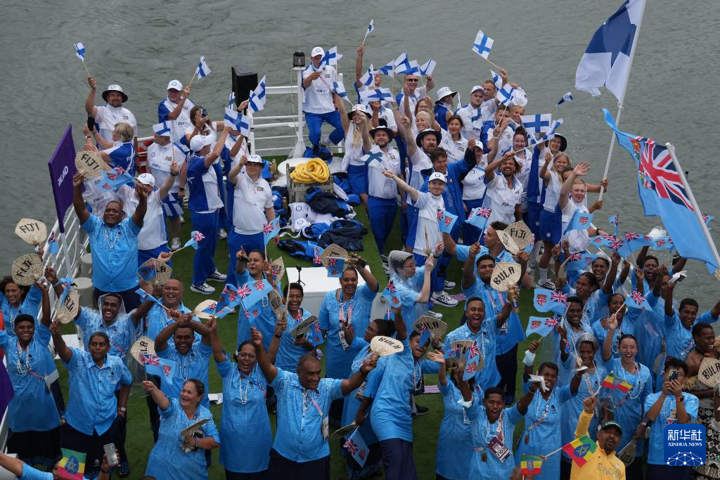 7月26日,芬蘭體育代表團(上)與斐濟體育代表團在開幕式上。新華社記者 萬象 攝