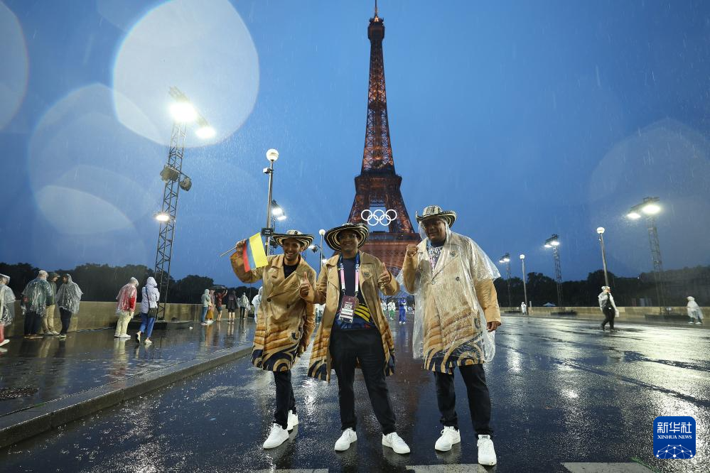 7月26日,哥倫比亞體育代表團成員在埃菲爾鐵塔前。新華社記者 李明 攝