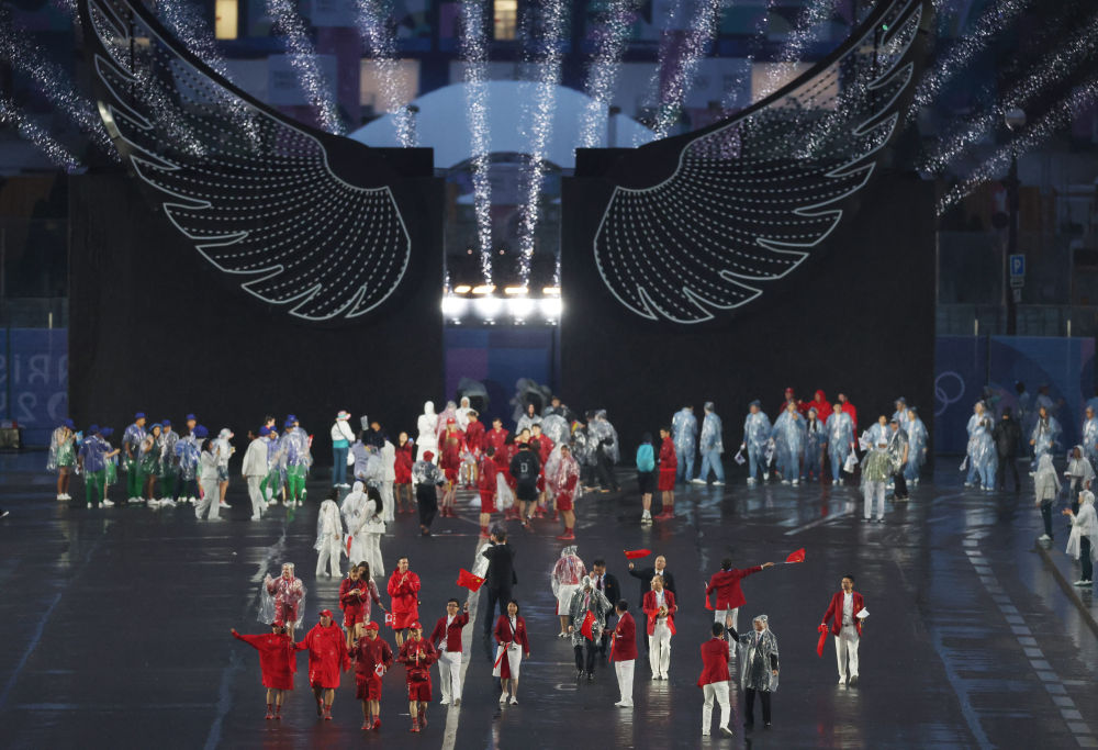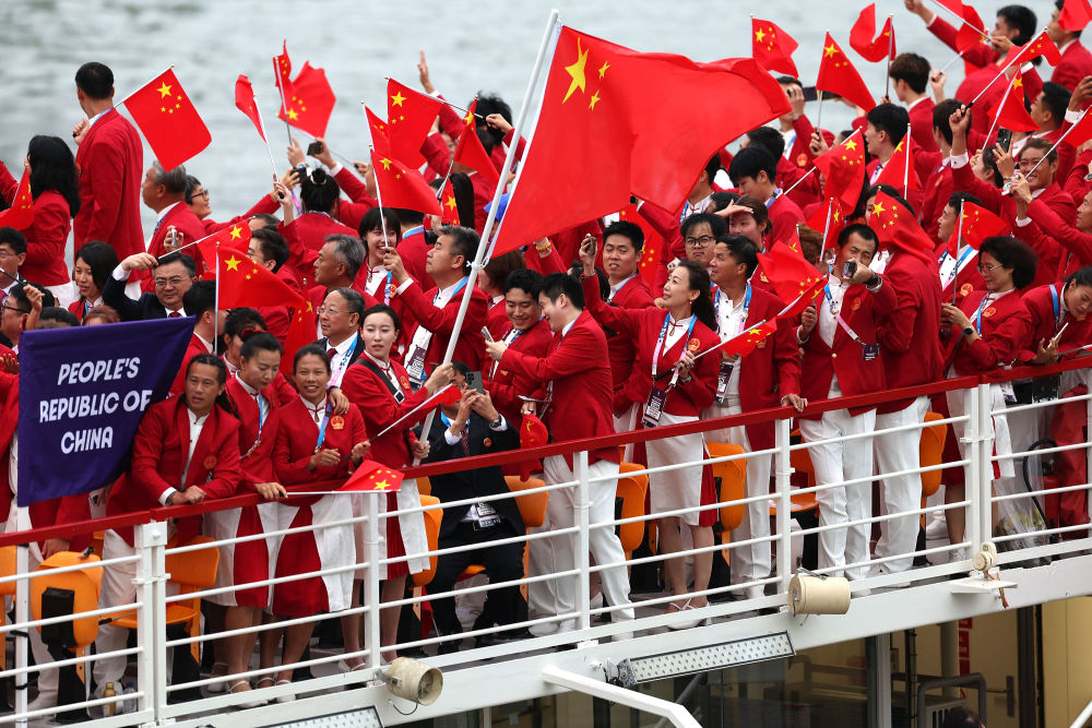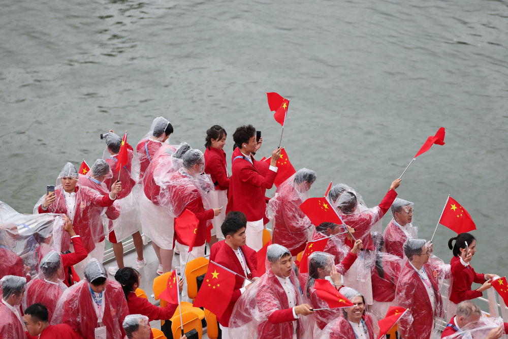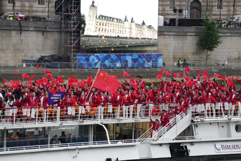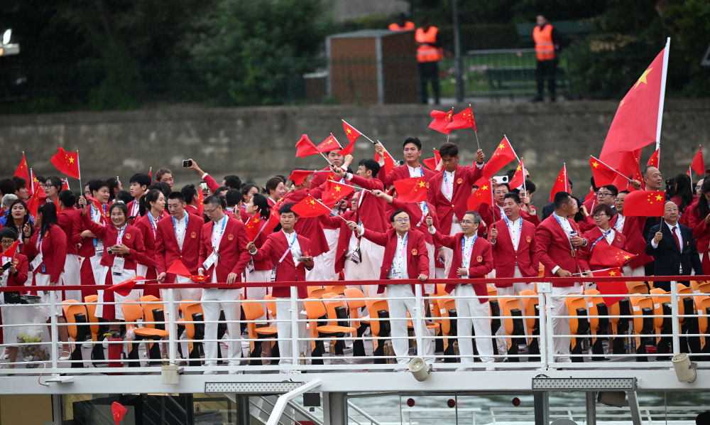 當(dāng)?shù)貢r間7月26日,第33屆夏季奧林匹克運動會開幕式在法國巴黎舉行。乒乓球運動員馬龍、花樣游泳運動員馮雨高擎五星紅旗,中國體育代表團運動員乘船在塞納河巡游。