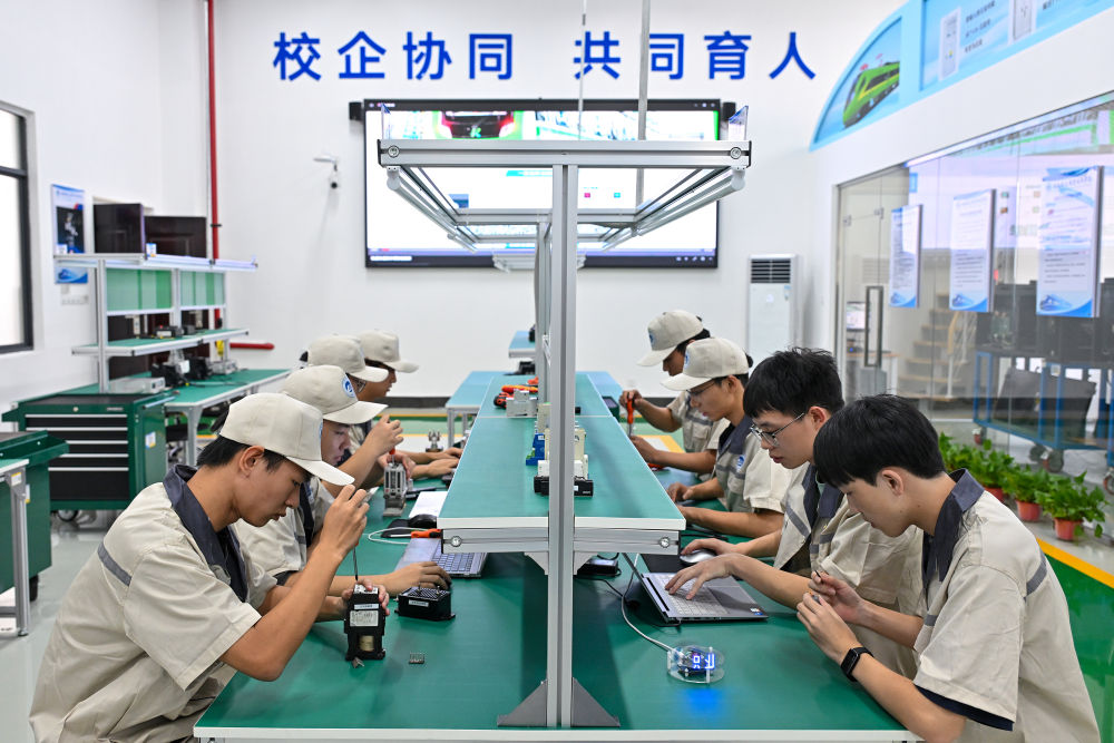 7月26日,湖南鐵道職業(yè)技術(shù)學(xué)院的學(xué)生在車載電源系統(tǒng)運(yùn)維實(shí)訓(xùn)室進(jìn)行核心零部件的拆裝與檢測訓(xùn)練。該實(shí)訓(xùn)室可開展軌道車輛逆變裝置運(yùn)行、維護(hù)、試驗(yàn)、檢修等實(shí)習(xí)實(shí)訓(xùn),電源變換技術(shù)、電力電子技術(shù)等課程實(shí)習(xí)實(shí)訓(xùn)。新華社記者 李鑫 攝