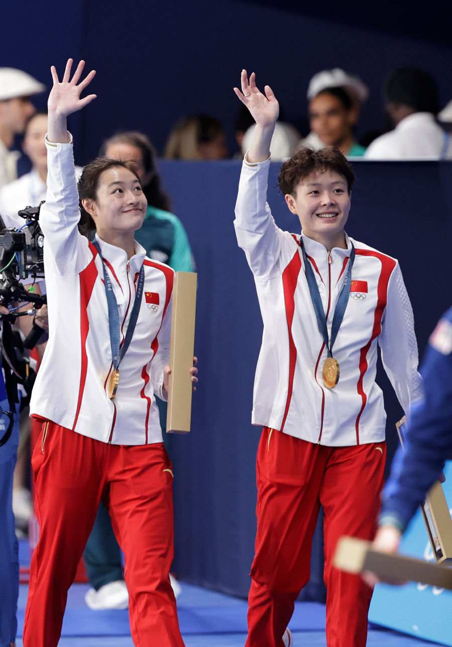 7月27日,中國選手昌雅妮(左)/陳藝文向觀眾揮手致意。新華社記者 張玉薇 攝