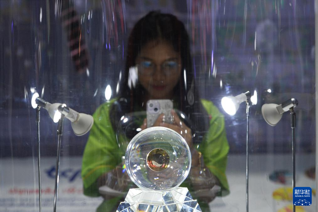 7月23日,一名女子在泰國(guó)曼谷舉行的“2024泰國(guó)未來(lái)科學(xué)力量展覽會(huì)”上拍攝展出的嫦娥五號(hào)月壤樣品。新華社發(fā)(拉亨攝)