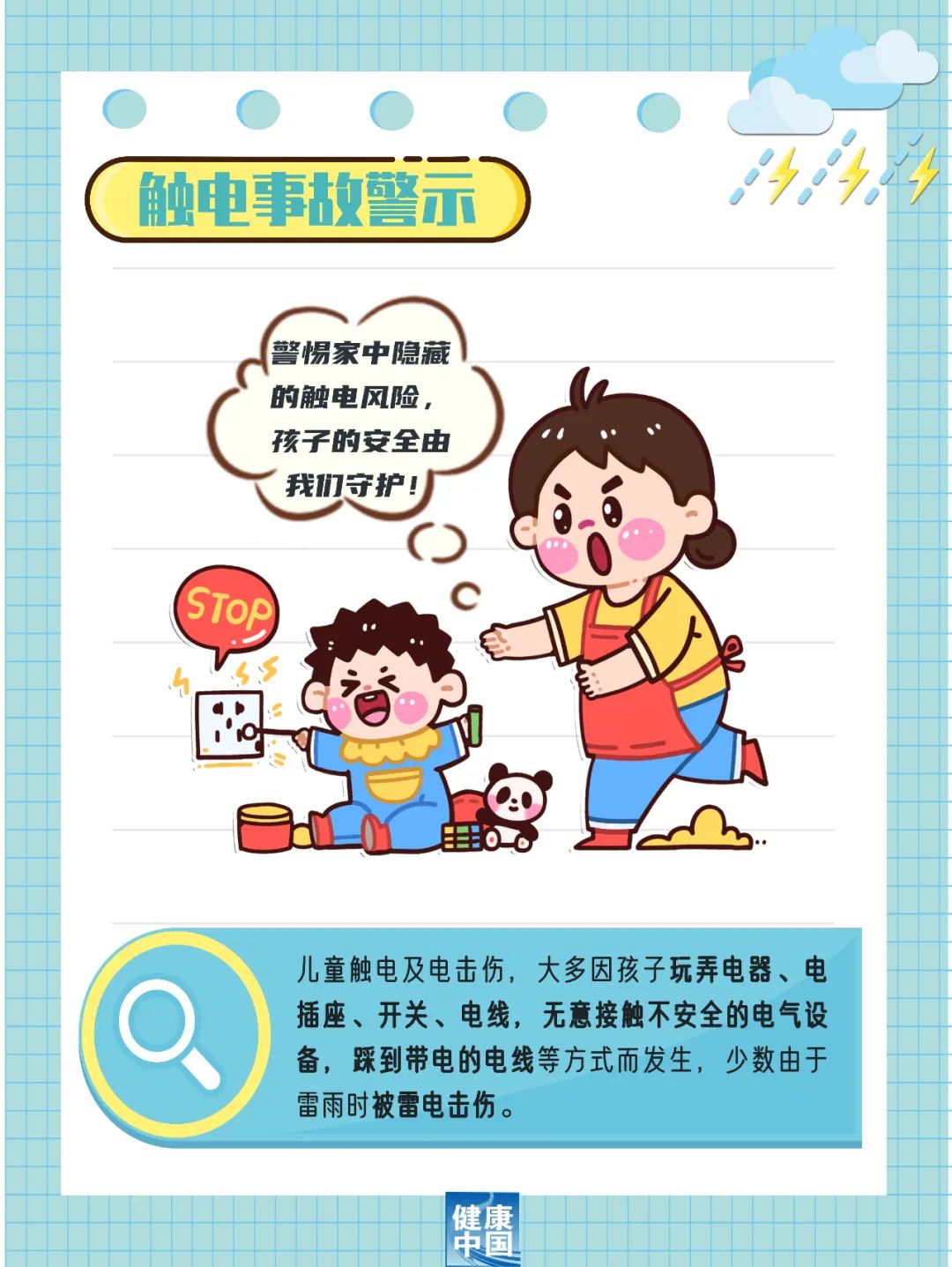 雷雨天氣不要讓孩子在室外玩耍;……倘若還是不小心觸電了,怎么辦?圖中知識快記牢!