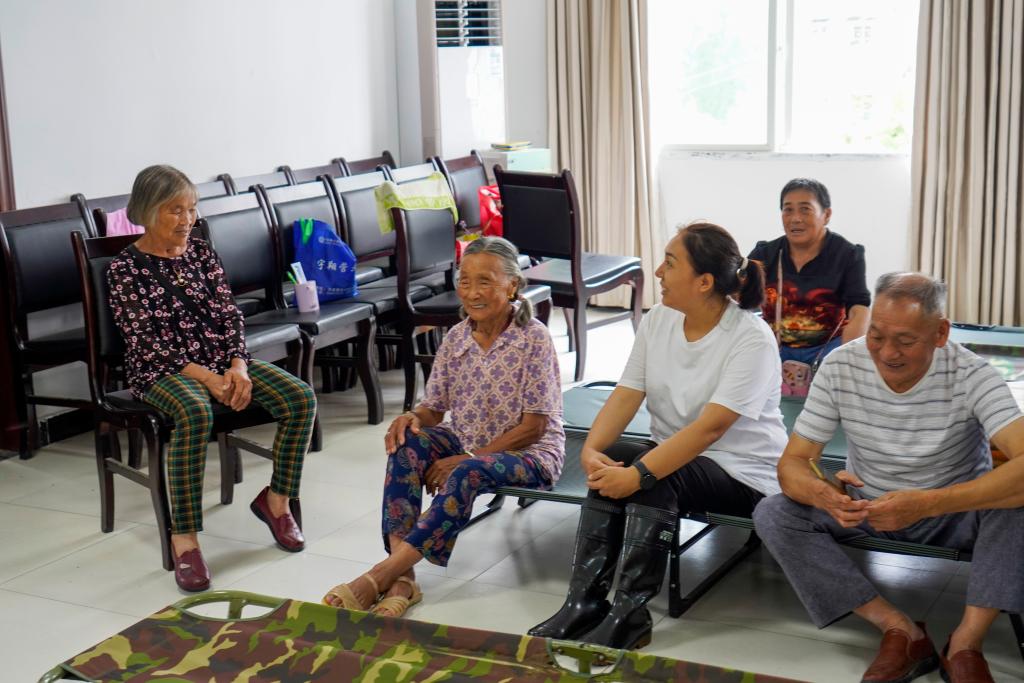 7月30日,富強(qiáng)村村委會辦公點(diǎn)內(nèi),村黨支部書記謝小紅(右二)和被安置的群眾聊天,了解他們的困難和需求。新華社記者 劉潺 攝