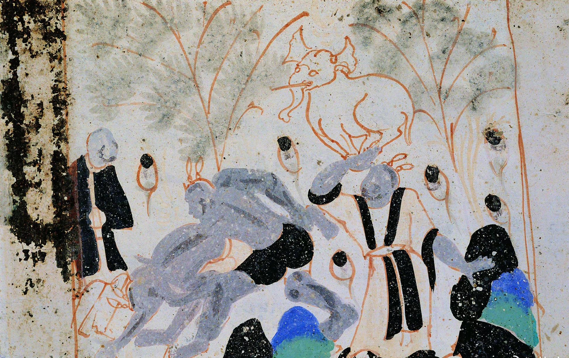 摔跤:古代運動中,摔跤就一直是主要的比賽項目之一。莫高窟第290窟中就描繪了一場緊張的摔跤比賽,畫面上,兩名頭扎丱角髻,下穿兜襠的對手正在一決勝負,旁邊還繪有裁判。這幅千年前的畫面將摔跤、相撲比賽中講求技巧和戰(zhàn)術(shù)形象地表現(xiàn)了出來。莫高窟第290窟,北周。