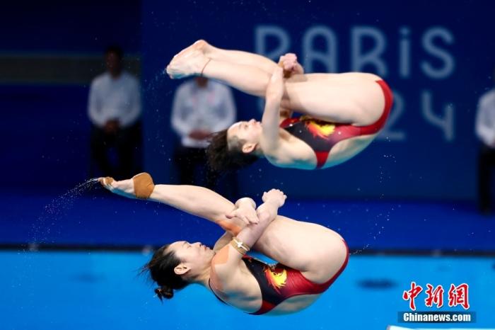 當(dāng)?shù)貢r間7月27日,中國組合昌雅妮(下)/陳藝文在比賽中。當(dāng)日,在巴黎奧運(yùn)會跳水女子雙人3米板決賽中,中國組合昌雅妮/陳藝文奪得金牌。 中新社記者 富田 攝