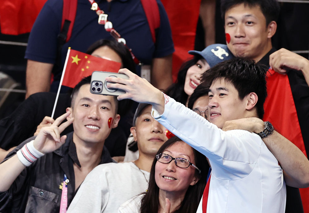 ↑中國選手潘展樂(左一)在頒獎儀式后與觀眾合影。新華社記者 雒圓 攝