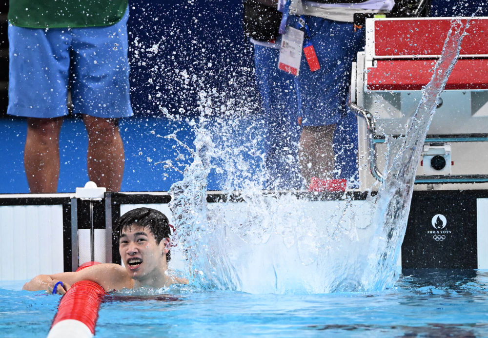 ↑中國選手潘展樂(右)與亞軍澳大利亞選手查默斯在比賽后慶祝。