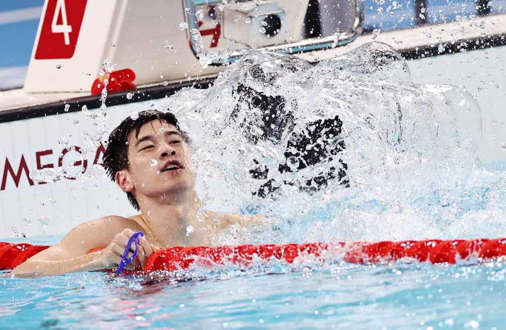 ↑中國選手潘展樂在頒獎儀式上。新華社記者 杜宇 攝