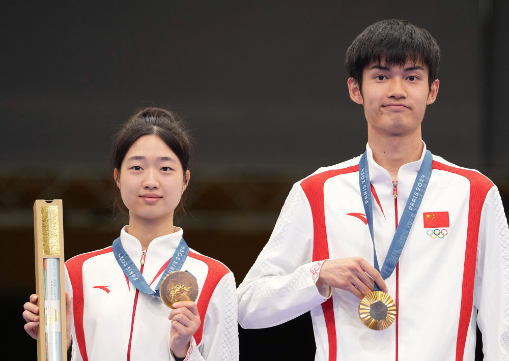7月27日,冠軍中國選手黃雨婷(左)/盛李豪在頒獎儀式上。當日,在法國沙托魯舉行的巴黎奧運會射擊10米氣步槍混合團體決賽中,中國選手黃雨婷/盛李豪奪冠,贏得巴黎奧運會首枚金牌。新華社記者 鞠煥宗 攝