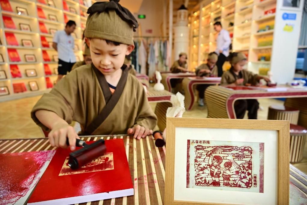 暑假期間,位于青島棧橋書店的印象國風(fēng)藝術(shù)館舉行拓印研學(xué)活動,吸引學(xué)生前來學(xué)習(xí)、體驗。新華社記者 李紫恒 攝
