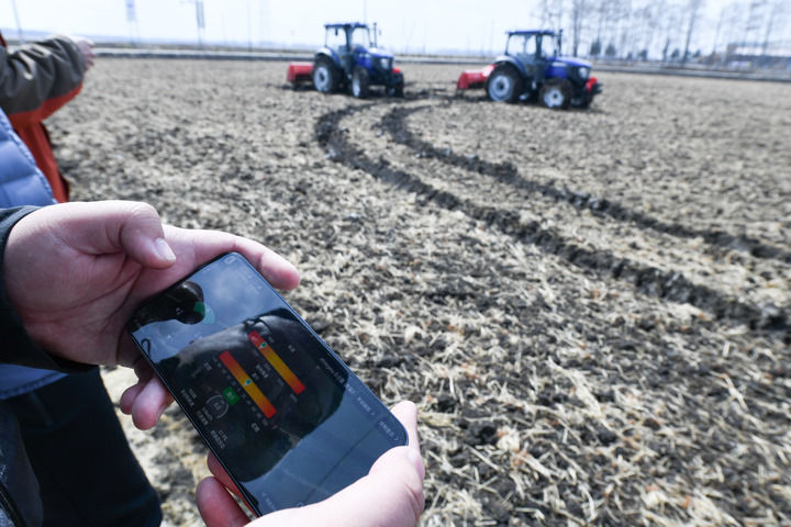 在黑龍江北大荒農(nóng)業(yè)股份有限公司友誼分公司智慧農(nóng)場的地塊內(nèi),技術人員操作兩輛拖拉機進行無人駕駛測試(2024年4月3日攝)。