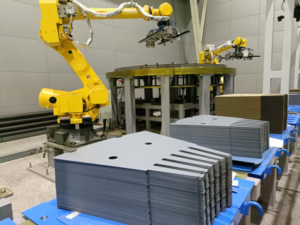 在哈電集團(tuán)哈爾濱電機(jī)廠有限責(zé)任公司沖剪分廠,操作者正在調(diào)整自動(dòng)涂漆線機(jī)械手。新華社記者朱悅 攝