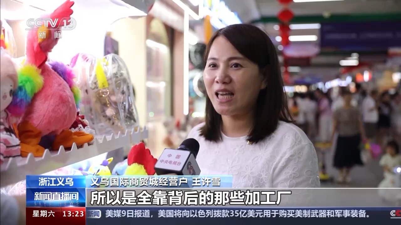 義烏國際商貿城經營戶 王許雪:像我們背后都有100來家工廠給我們供應,所以是全靠背后的那些加工廠來支持我們,全國各地的都有。