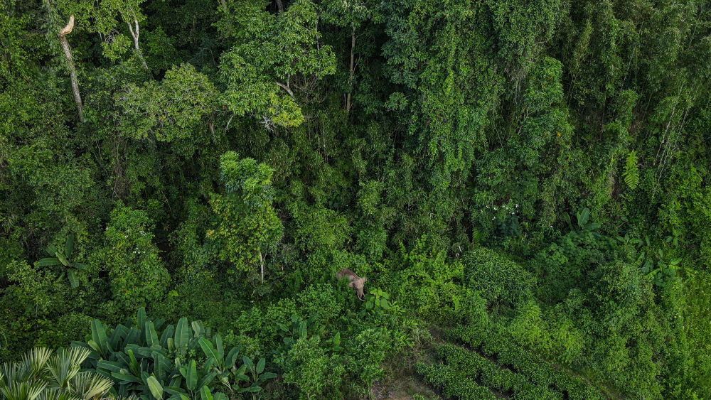 在云南西雙版納國(guó)家級(jí)自然保護(hù)區(qū)勐養(yǎng)片區(qū)邊緣活動(dòng)的亞洲象阿寶(7月26日無(wú)人機(jī)照片)。(許團(tuán)明 攝)