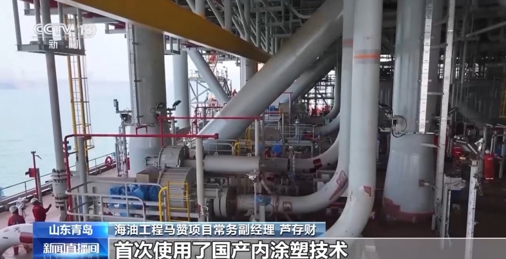 海油工程馬贊項目常務副經理 蘆存財:我們現在看到的是36寸原油外輸管線,首次使用了國產內涂塑技術,解決硫化氫高的同時,實現了25年的長期安全服役。