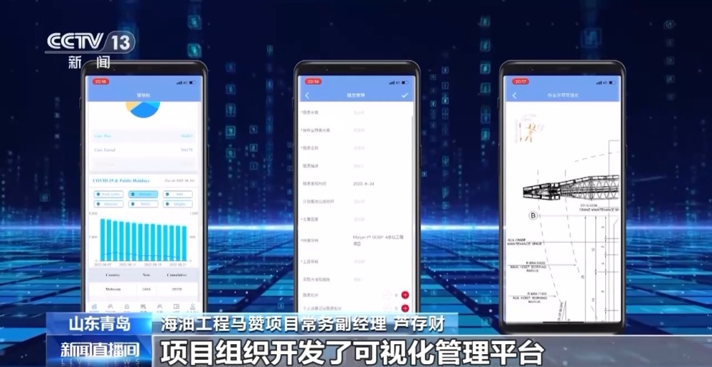 海油工程馬贊項目常務副經理 蘆存財:對一個總重近2萬噸的超級組塊,平臺材料、設備成千上萬,項目組織開發(fā)了可視化管理平臺,通過數字模擬、建造孿生技術實現建造全流程的數字化管控。
