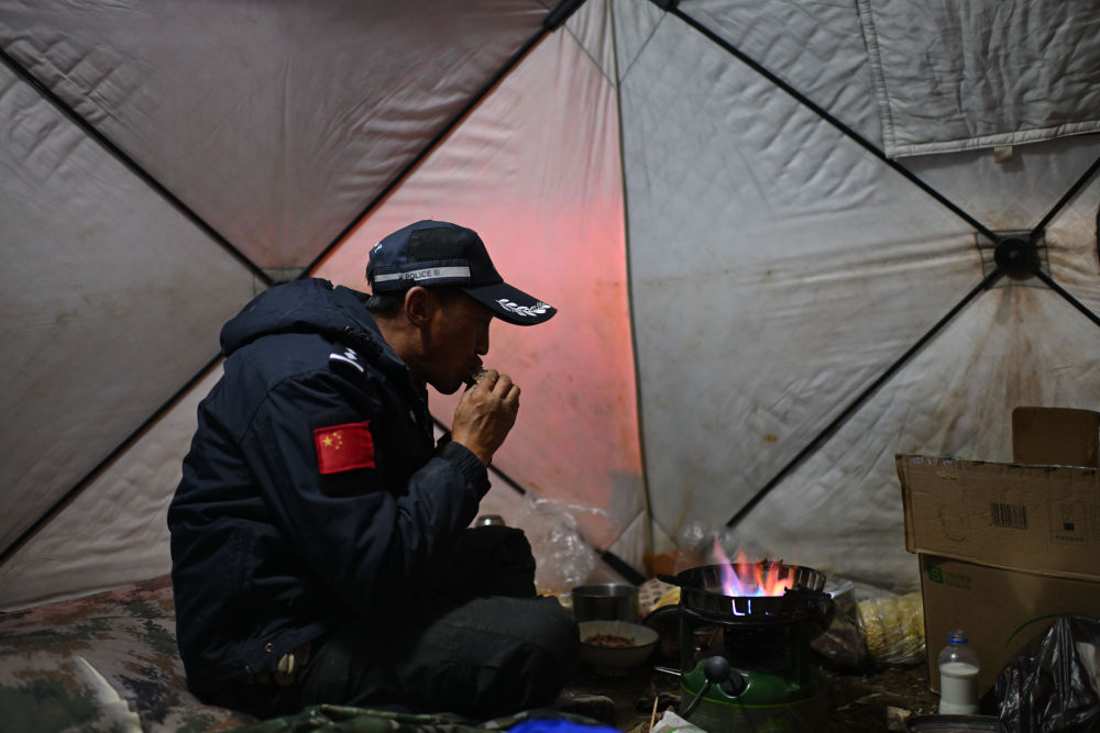 7月8日,在可可西里卓乃湖區(qū)域,巡山隊(duì)員尼瑪扎西在帳篷里吃晚飯。新華社記者 張龍 攝
