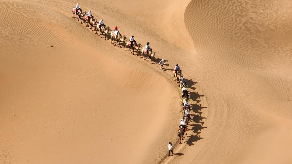 7月26日,游客在寧夏中衛(wèi)市沙坡頭景區(qū)體驗騎駱駝。新華社記者 呂帥 攝