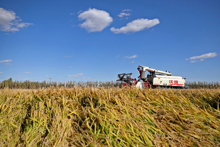 農(nóng)業(yè)機(jī)械在遼寧盤錦市遼河三角洲尤巧元家庭農(nóng)場的稻田里收割水稻(2023年10月20日攝)。新華社記者 姚劍鋒 攝