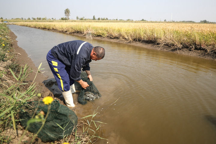 工作人員在遼寧盤錦市大洼區(qū)三角洲“蟹稻+”綜合種養(yǎng)模式試驗基地的稻田收獲河蟹(2022年9月28日攝)。新華社記者 潘昱龍 攝