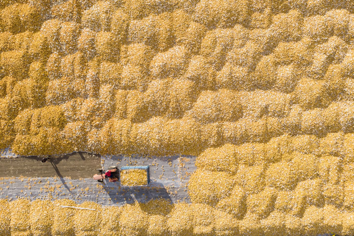 在黑龍江省肇東市五里明鎮(zhèn)東升村,農(nóng)民把收獲的玉米運到當(dāng)?shù)剞r(nóng)業(yè)合作社指定的地點進(jìn)行晾曬(2023年10月19日攝,無人機(jī)照片)。新華社記者 謝劍飛 攝
