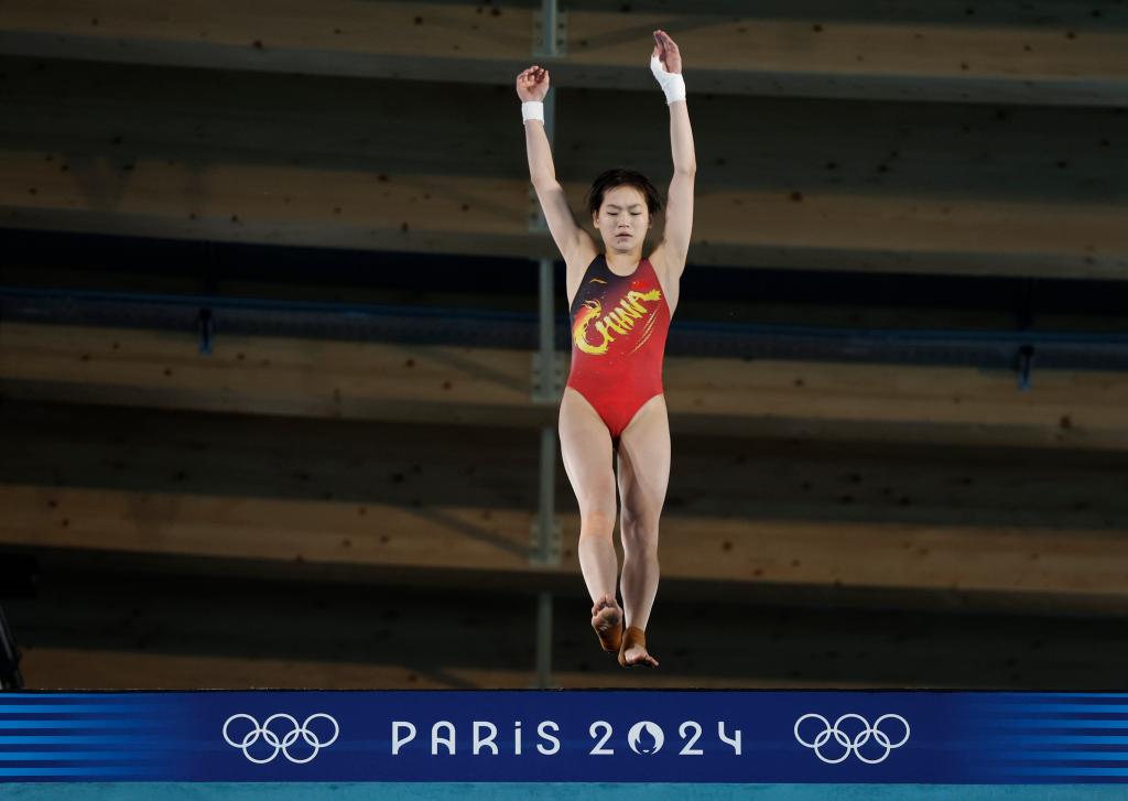 8月5日,中國選手全紅嬋在巴黎奧運(yùn)會(huì)跳水女子10米臺(tái)半決賽中。新華社記者 張玉薇 攝