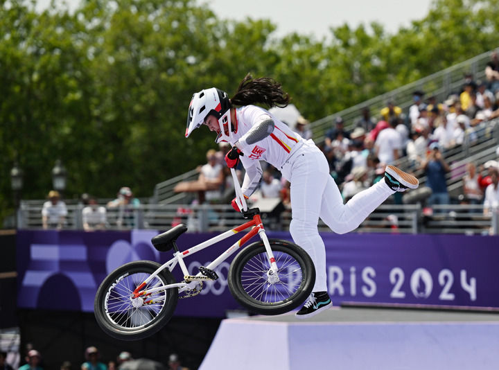 中國選手鄧雅文在巴黎奧運會自由式小輪車女子公園賽決賽中獲得冠軍(2024年7月31日攝)。新華社記者 胡虎虎 攝