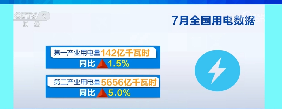 入夏以來(lái),全國(guó)多地出現(xiàn)持續(xù)性高溫天氣,最大用電負(fù)荷快速攀升,電力供應(yīng)保障有力有效。7月份,全社會(huì)用電量9396億千瓦時(shí),同比增長(zhǎng)5.7%。從分產(chǎn)業(yè)用電看,第一產(chǎn)業(yè)用電量142億千瓦時(shí),同比增長(zhǎng)1.5%;第二產(chǎn)業(yè)用電量5656億千瓦時(shí),同比增長(zhǎng)5.0%;第三產(chǎn)業(yè)用電量1871億千瓦時(shí),同比增長(zhǎng)7.8%;城鄉(xiāng)居民生活用電量1727億千瓦時(shí),同比增長(zhǎng)5.9%。
