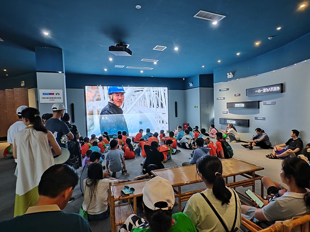 8月14日,來自河南鄭州研學(xué)團(tuán)隊的中小學(xué)生在南仁東事跡館觀看影片。新華社記者 齊健 攝