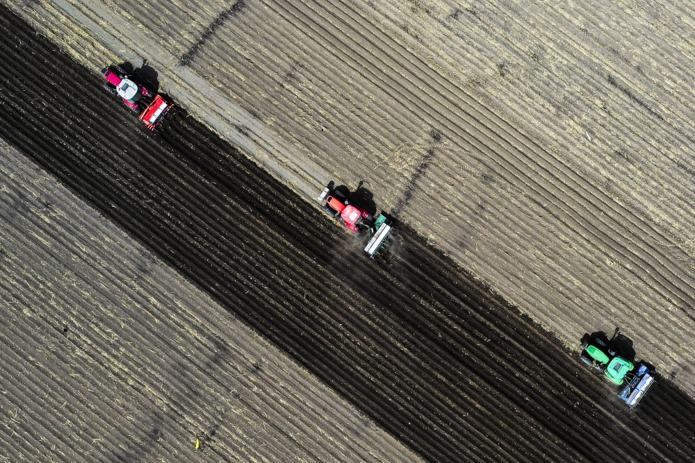 2024年6月25日,大型農(nóng)機在黑龍江北大荒集團鶴山農(nóng)場作業(yè),為土壤增溫放寒(無人機照片)。今年,黑龍江推進高標準農(nóng)田建設、侵蝕溝治理和農(nóng)田防護林更新修復一體化實施,建設高標準農(nóng)田1400萬畝、治理侵蝕溝1.2萬條,全面加強黑土地保護利用。