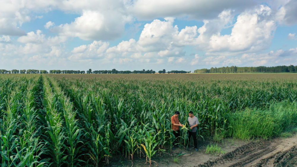 2024年8月8日,在吉林省梨樹縣孤家子鎮(zhèn)兩家子村,當?shù)剞r(nóng)業(yè)發(fā)展服務站高級農(nóng)藝師蘭雨壯(左)與四平市強盛農(nóng)機農(nóng)民專業(yè)合作社負責人查看玉米長勢(無人機照片)。多年來,地處世界“黃金玉米帶”的全國產(chǎn)糧大縣吉林省梨樹縣,強化科技在農(nóng)業(yè)生產(chǎn)中的支撐作用,持續(xù)提升糧食和重要農(nóng)產(chǎn)品穩(wěn)產(chǎn)保供能力。