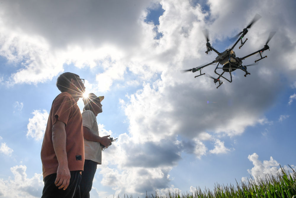 2024年8月8日,在吉林省梨樹縣孤家子鎮(zhèn),當?shù)剞r(nóng)業(yè)發(fā)展服務站高級農(nóng)藝師蘭雨壯(左)查看無人機作業(yè)情況。