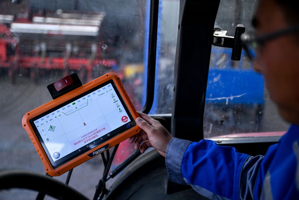 2023年4月12日,在內(nèi)蒙古通遼市科爾沁左翼中旗腰林毛都鎮(zhèn),一家農(nóng)業(yè)合作社的負責人檢修拖拉機上的衛(wèi)星定位系統(tǒng)。