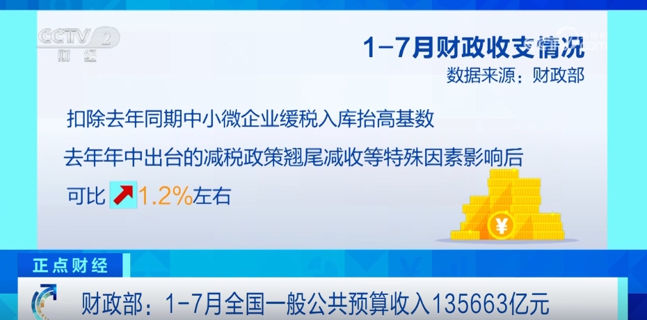 數(shù)據(jù)顯示,1—7月,全國(guó)一般公共預(yù)算收入135663億元,同比下降2.6%,扣除去年同期中小微企業(yè)緩稅入庫(kù)抬高基數(shù)、去年年中出臺(tái)的減稅政策翹尾減收等特殊因素影響后,可比增長(zhǎng)1.2%左右。