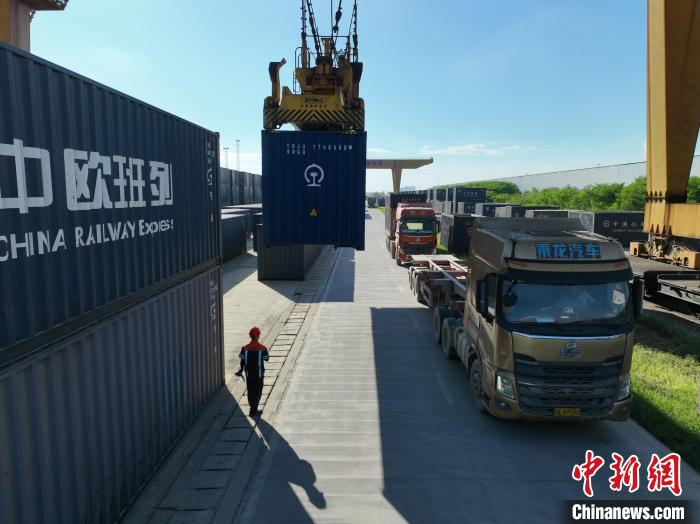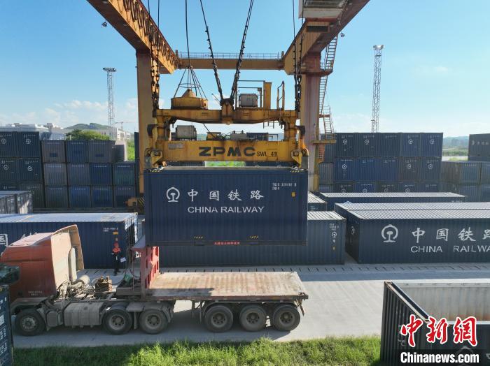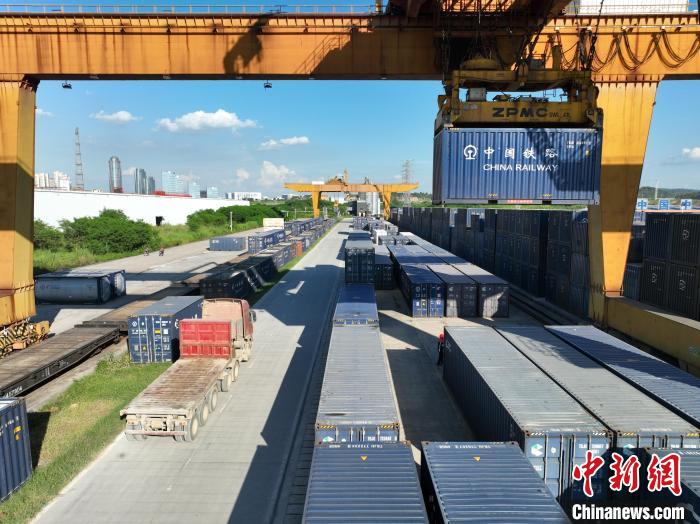 8月26日,廣西南寧國際鐵路港內(nèi),鐵路職工頂著下午的烈日,正在為發(fā)往越南的貨運(yùn)班列裝卸貨物。該鐵路港是廣西始發(fā)中越班列的核心場(chǎng)站。國鐵南寧局提供的信息顯示,今年前7個(gè)月,廣西始發(fā)中越班列累計(jì)發(fā)運(yùn)貨物6850標(biāo)箱,同比增長16倍;其中7月份發(fā)運(yùn)1922標(biāo)箱,超過今年一季度發(fā)運(yùn)量總和,為今年以來第三次刷新單月發(fā)運(yùn)量紀(jì)錄。圖為集裝箱擺滿場(chǎng)站,等待裝車。王以照 攝
