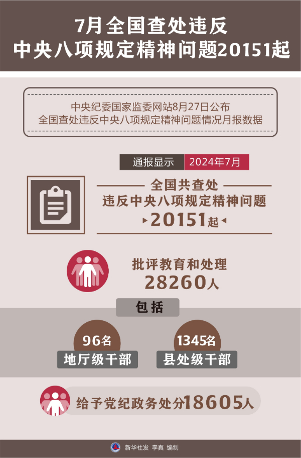 中央紀(jì)委國家監(jiān)委網(wǎng)站27日公布全國查處違反中央八項(xiàng)規(guī)定精神問題情況月報(bào)數(shù)據(jù)。通報(bào)顯示,今年7月,全國共查處違反中央八項(xiàng)規(guī)定精神問題20151起,批評(píng)教育和處理28260人(包括96名地廳級(jí)干部、1345名縣處級(jí)干部),給予黨紀(jì)政務(wù)處分18605人。
