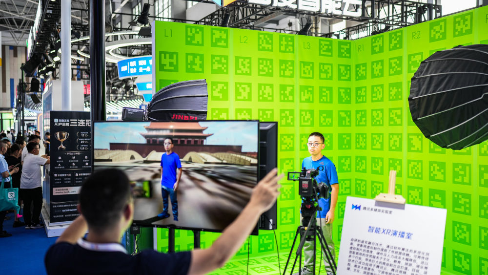 ↑8月28日,參觀者在數(shù)博會(huì)展館內(nèi)體驗(yàn)智能XR演播室。
