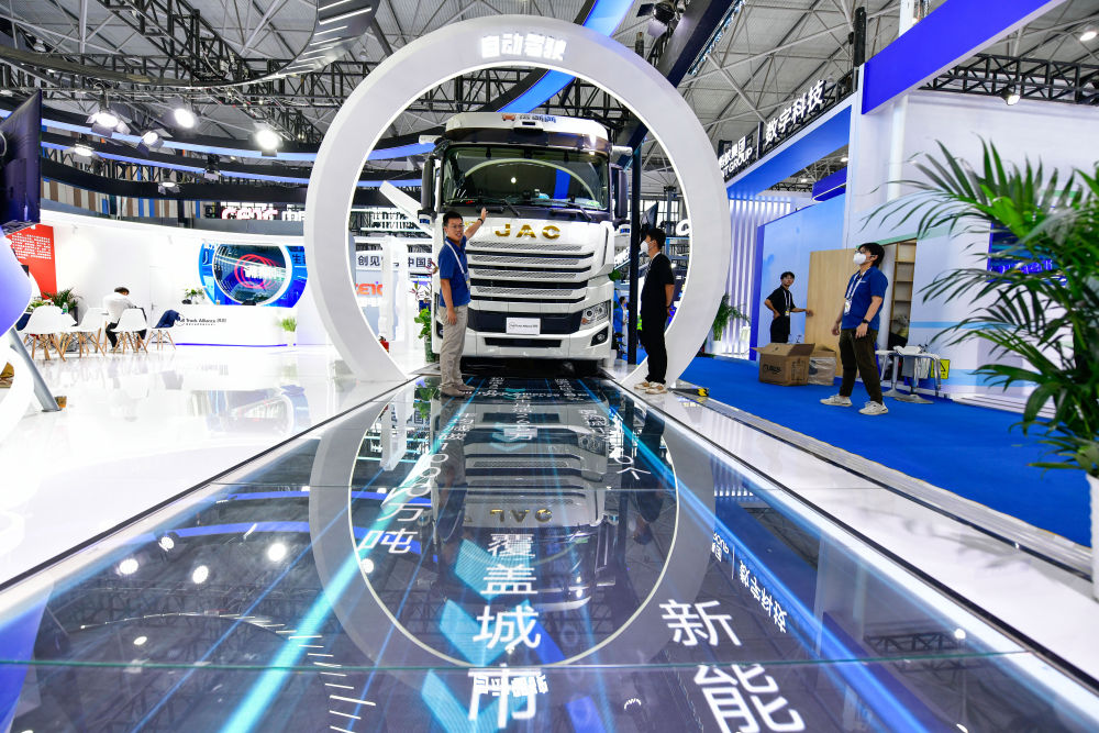 8月28日,工作人員在數(shù)博會(huì)上介紹無(wú)人駕駛重型卡車。