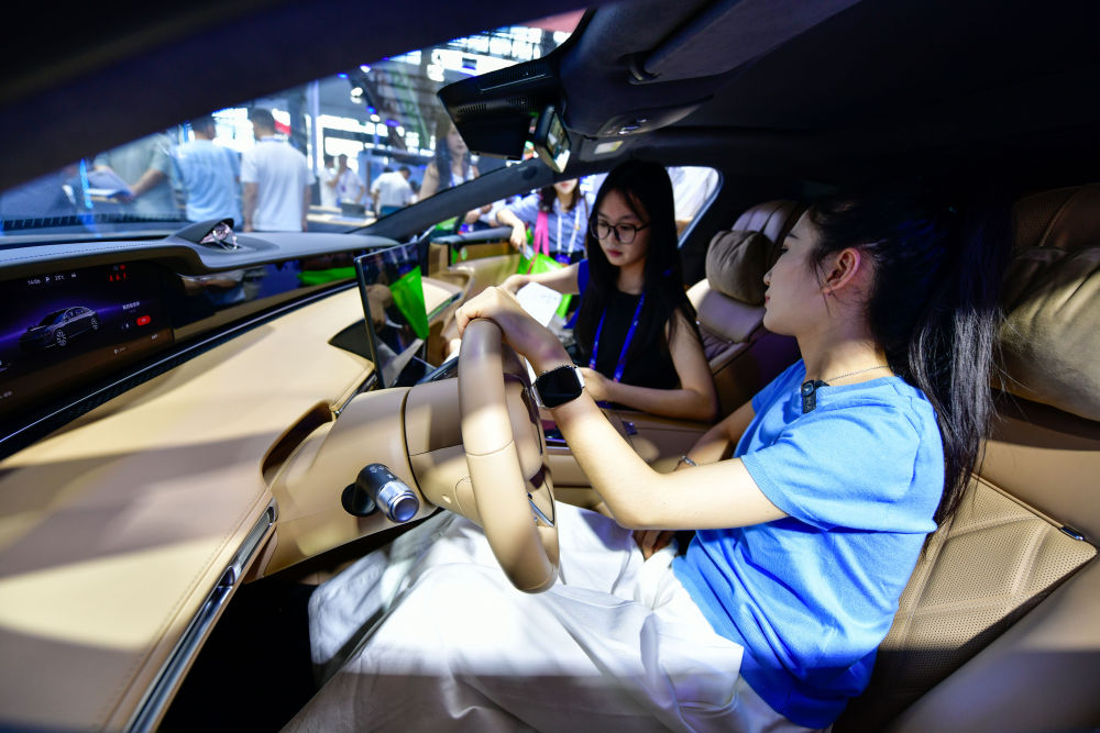 8月28日,參會(huì)人員在數(shù)博會(huì)上體驗(yàn)新能源智能駕駛汽車。