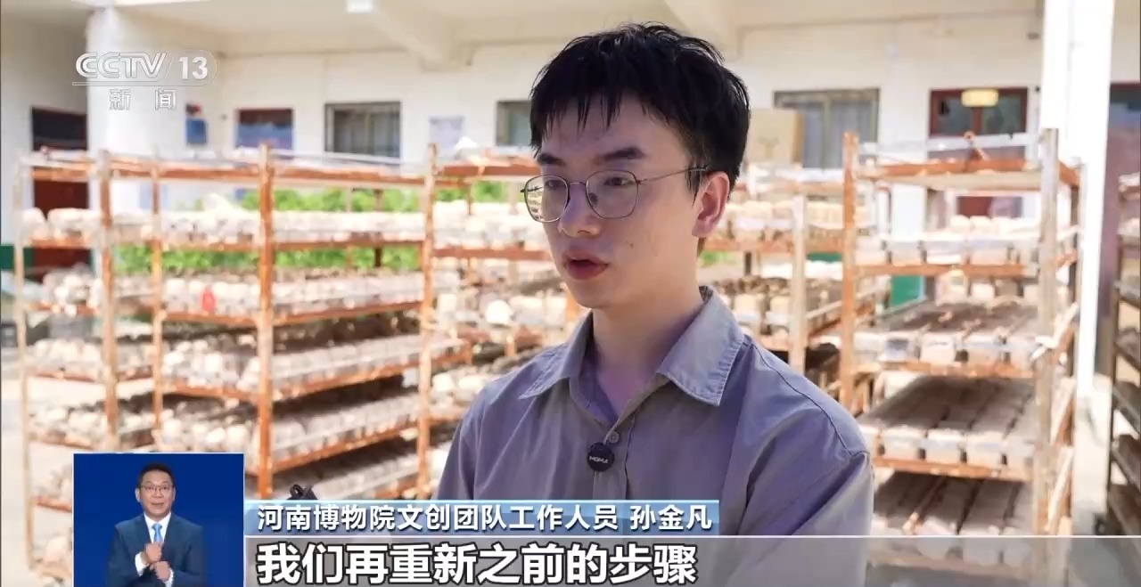 河南博物院文創(chuàng)團隊工作人員 孫金凡:和泥巴、調(diào)配方、做試驗,每天都是灰頭土臉的,就是還原文物在考古工作者出土?xí)r的那一瞬間。同學(xué)就會問,還在村里面呢?我說對,還在那和泥巴。