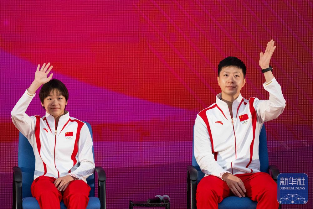 ↑9月1日,跳水運(yùn)動(dòng)員全紅嬋(左)與乒乓球運(yùn)動(dòng)員馬龍?jiān)诨顒?dòng)中揮手致意。