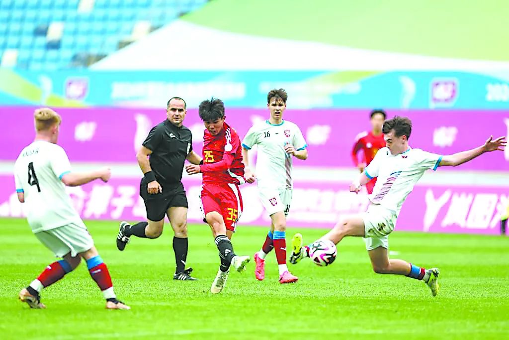 2024年國際中學(xué)生體育聯(lián)合會(huì)足球世界杯在遼寧省大連市舉行,中外球員角逐綠茵場(chǎng)。 遼寧省教育廳供圖